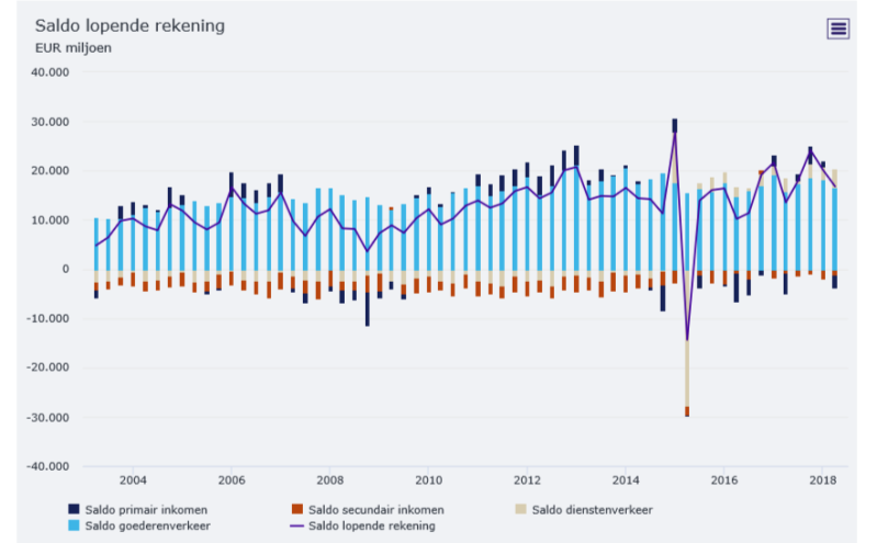 Op de lopende rekening staan alle transacties van een land die met het buitenland hebben te maken. Het gaat hierbij om transacties die te maken hebben met de productie en inkomensvorming. Uit deze statistiek kunnen we afleiden dat het saldo op de lopende rekening eigenlijk de hele tijd positief is. In het 2e kwartaal van 2015 was die alleen wel negatief. Als er een negatief is, is er een tekort. Dit betekent dat Nederland toen meer heeft geïmporteerd als geëxporteerd. Over het algemeen exporteert Nederland dus meer als dat het importeert. We verdienen dus wel geld aan de handel.