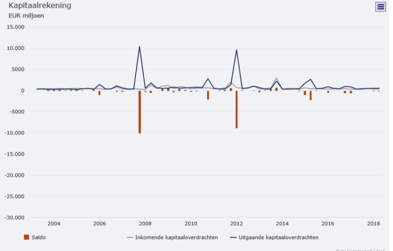 De kapitaalrekening weerspiegelt de netto verandering in het nationale vermogen in het land. Hier zijn de investeringen van buitenlandse ondernemingen in het binnenland en investeringen van het bedrijfsleven hier in het buitenland te zien. We zien hier dat de kapitaalrekening ook altijd positief is. Dit betekent dat er geld het land binnenstroomt. Ook hier staat dus weer dat wij geld verdienen aan de Europese Unie.
